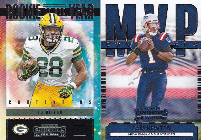 2020 Contenders Football: Been a long time since I've shown off this set. I like the design overall but there so little room for the photo it is easy to complain. Bought this pack in January, 2021 and finally getting to show it off. Hoping to see Adams have another good season. He's proven he can play no matter where he calls home.